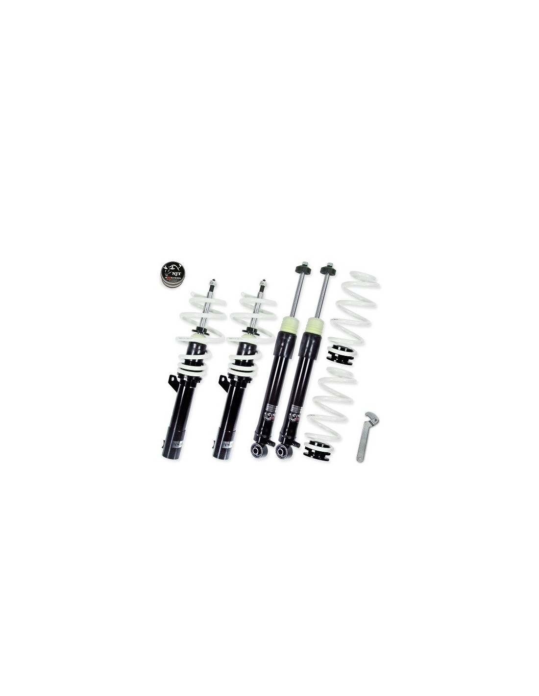 Kit ammortizzatori con ghiera filettata regolabile in altezza e molle cilindriche professionali sportive. La ghiera permette di regolare l'altezza e l'estensione degli ammortizzatori. Le molle cilindriche progressive accompagnano lo stelo in tutta la sua estensione e compressione e sono rinforzati del 40%. Paraolio a doppio effetto con piastra in acciaio. Pistone e guida in ghisa centrifugata autolubrificante. Materiali maggiorati consentono all'ammortizzatore ed alle molle di sopportare carichi e sollecitazioni che non sarebbero possibili con ammortizzatori originali. L'abbassamento varia dai 20 ai 60mm. Questo kit personalizza lo stile di guida e fa la differenza nella guida sportiva.